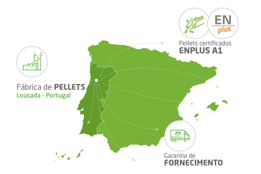 Produzidos no coração de Portugal, em Lousada, os nossos pellets certificados ENplus A1 garantem uma qualidade constante e um desempenho elevado. A produção local e controlada permite assegurar a continuidade do fornecimento e uma distribuição eficiente em toda a Península Ibérica, respeitando elevados padrões de sustentabilidade ambiental.